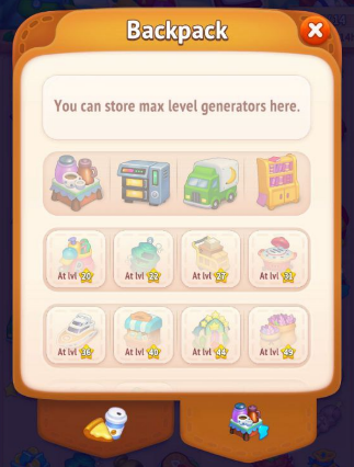 The Backpack also has a generator section, where you can place certain maximum level generators. Each generator can only be placed in a specific slot.